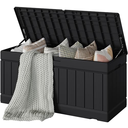 Clever Function Design: Patio storage box features handles on both sides for easy mobility. The hydraulic hinge design prevents pinching and ensures safety. It also comes with a lockable lid for added security. Furthermore, it can be used as a two-person seating bench