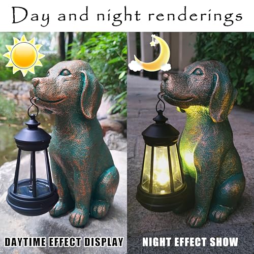 ?Unique design?This charismatic dog gracefully holding a solar lantern, adds a touch of magic to your outdoor space, casting a warm and welcoming glow.The size of this dog figurine is 9.8X6.3X4.1inches,the lantern is 5.5X2.75X2.75inches.The dog figurines made of resin material, hand-painted and finished with a UV resistant coating can withstand rain, snow or scorching sun without fading.