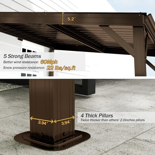 Preminum Durability - Constructed with dual-protected galvanized & powder-coated steel (3.94" columns + 5 reinforced 5.2" beams) to resist rust, UV damage, and withstand 60 mph winds/22 lbs/sq.ft snow – 2X stronger than standard pergolas.