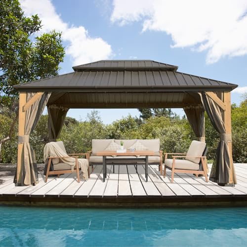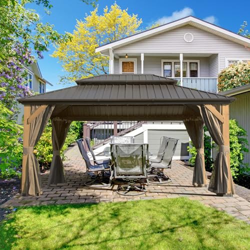 ENHANCED VENTILATION: With a double-tier roof design, the domi wood gazebo 12'x16' ensures efficient airflow and protection from strong winds and rain. The powder-coated metal roof provides shade, enabling comfortable outdoor gatherings in any weather.