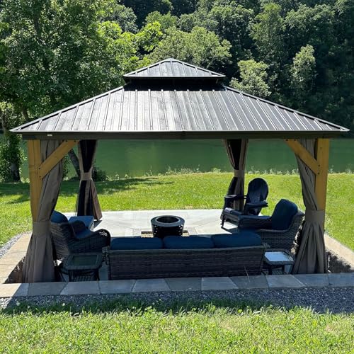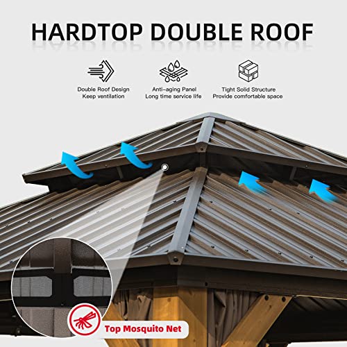 Galvanized Steel Double Roof - Domi cedar wooden gazebo 12x12 is all weather resistant and strong enough to withstand 2500 LBS of snow.Double-layer with built-in netting can prevent fallen leaves and keep air circulating.Hooks on the inner top can hang lights or fans.
