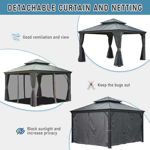 [Privacy Protection and Multiple Usage] In addition to adding privacy and shielding the area from UV rays, the detachable curtains and netting also act as an insect and mosquito barrier. Whether it's for a bigger event like a wedding or birthday celebration or just a casual get-together with friends, the permanent gazebo can provide a comfortable outdoor setting for hosting people.