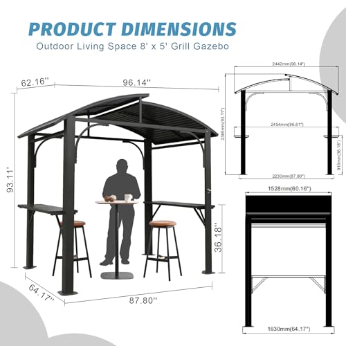 Generous Grilling Shelter- The Domi grill gazebo, measuring 96.14”L x 64.17”W x 93.11”H, provides ample room for various grilling setups, along with space for food preparation and storage of grilling essentials. This makes your grill canopy the ideal spot for gatherings and grilling.