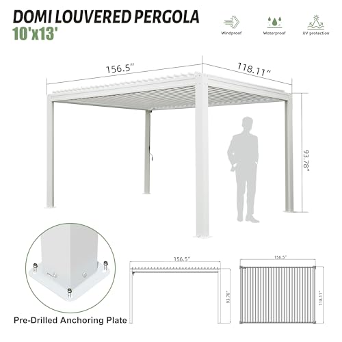 Durable and All Weather Use- The Domi louvered pergola is crafted from premium aluminum and high-strength galvanized steel, ensuring exceptional durability and weather resistance. Built to withstand any weather conditions, this pergola offers long-lasting performance and reliability for your outdoor space.