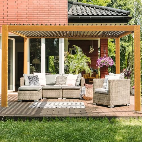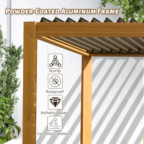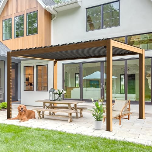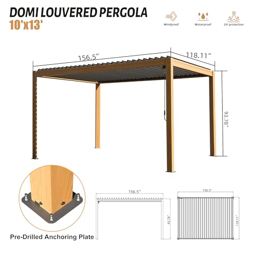 Domi Louvered Pergola 10X13FT, Wood Grain Aluminum Pergola with Adjustable Louvered Roof and Drainage Gutter, Outdoor Gazebo for Patio, Backyard, Deck
