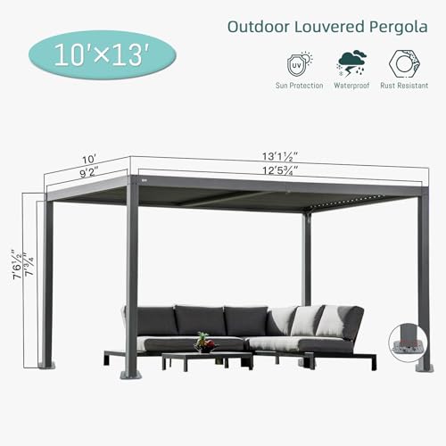 Oversize Sunshade - This Domi outdoor pergola measures 13' L X 10' W x 7.6' H and it provide 130 square feet shade.This permanent aluminum pergola become a perfect choice for outdoor barbecue,party or daily relaxation with your family and friends.What’s more,you can use it as an outdoor parlor or even a parking shed for your car.
