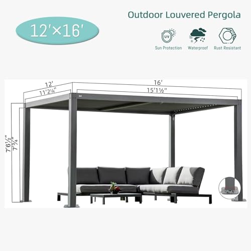 NO Corrosion NO Rusting - Crafted with High-Quality Full Aluminum Poles and Aluminum Louvered Roof, Domi 12x16 pergola is is sturdy, rust&corrosion resistant that last for years of usage. Comes with pre-drilled base for each post,we suggest use expansion screws to make the whole system much more stable.