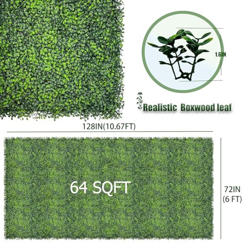 Product Description:Each boxwood roll panel has 7392 fake leaves. Dense and realistic which can cover 64 square feet.128 in * 72 in each. 1.6 in high.Have a 3D sense.Can be disassembled into small pieces or spliced into larger grass panels. Install anywhere you want to decorate.Create a vibrant atmosphere.