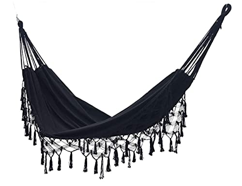 Double Sized Boho Macrame Black Hammock with Elegant Tassels and Fishtail Knitting 485Lbs Includes Tie Ropes and Black Drawstring Bag for Women