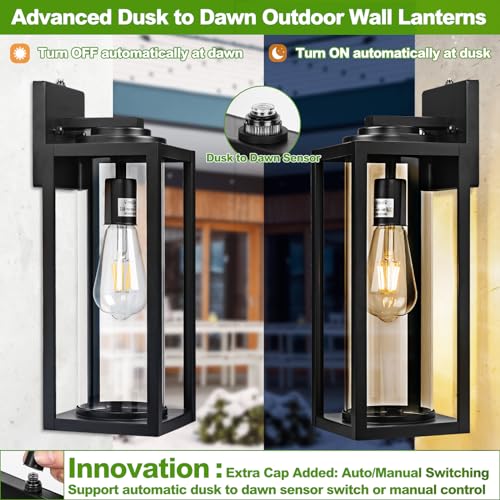 ?Advanced Dusk to Dawn Sensor & Manual Control Option?Step into the future with our outdoor wall light, featuring a state-of-the-art dusk-to-dawn sensor for smart, energy-efficient lighting.Say goodbye to manual switching; this dusk to dawn outdoor lighting fixture intuitively activates at dusk and turns off at dawn.For those times you prefer personal control, a convenient rubber cap is included for manual operation, offering versatile lighting tailored to your surround and preferences.