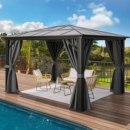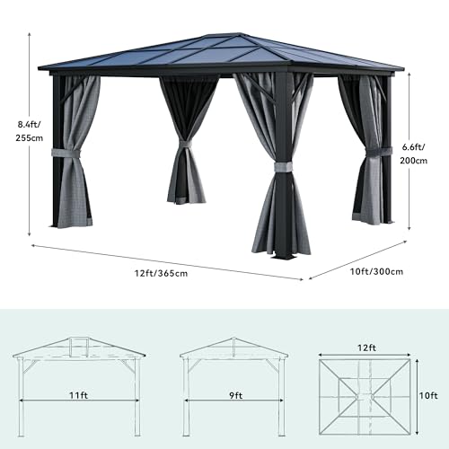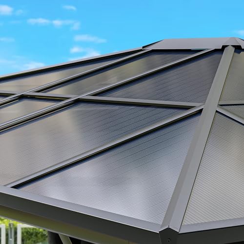 HARDTOP POLYCARBONATE ROOF- This 6mm thick all season gazebo protects against bad weather during outdoor activities; The heat insulation layer blocks 99% of harmful UV rays and reduces heat; Sleek roof slope design also prevents rain from gathering