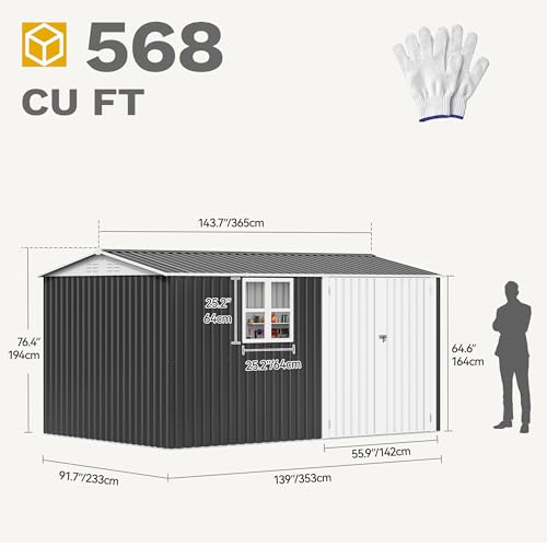 Ample Storage Capacity: Our 12'x8' outdoor storage shed measures 139''L x 91.7''W x 76.4''H, and provides a capacity of 568 Cuft; It offers a secure and weather-resistant shelter for garden tools, lawn equipment, bicycles, and outdoor supplies; Can also serve as a pet haven or a plant greenhouse