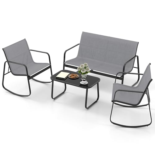 DWVO 4-Piece Patio Furniture Set, Textilene Conversation Set with 2 Rocking Chairs and Tempered Glass Coffee Table, Perfect for Indoor Patio Lawn Garden Poolside, Gray