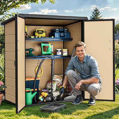 All-Season Durability: Built for all weather, this vertical outside storage shed is made from 12mm double-layer PP walls for effective resistance against sun, rain, and snow, keeping your outdoor tools and accessories dry and safe through all seasons