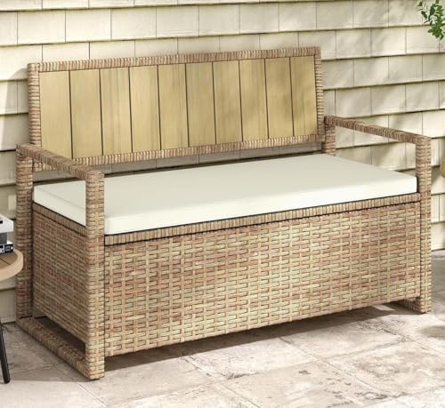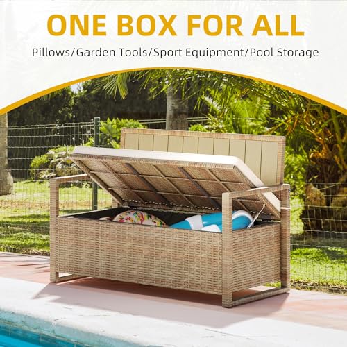 Versatile and functional: This rattan storage box is designed to keep your outdoor space tidy and protect your cushions, pool supplies, toys, and garden tools from the elements. Perfect for use in various outdoor areas such as the patio, garden, pool, and deck.