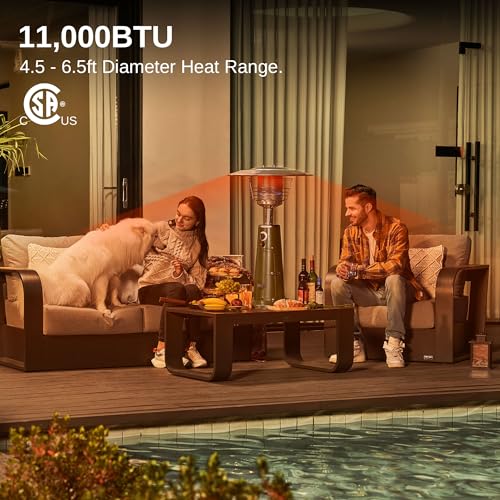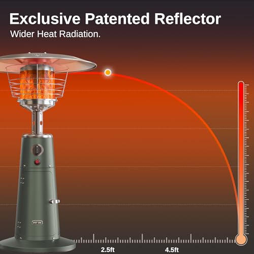 Powerful 11,000 BTU Output: Experience efficient heating with our outdoor patio heater. The patented design features a polished aluminum reflective cover that delivers proper heating in a 4.5-6.5ft diameter range, perfect for 1-2 people enjoying the outdoors.