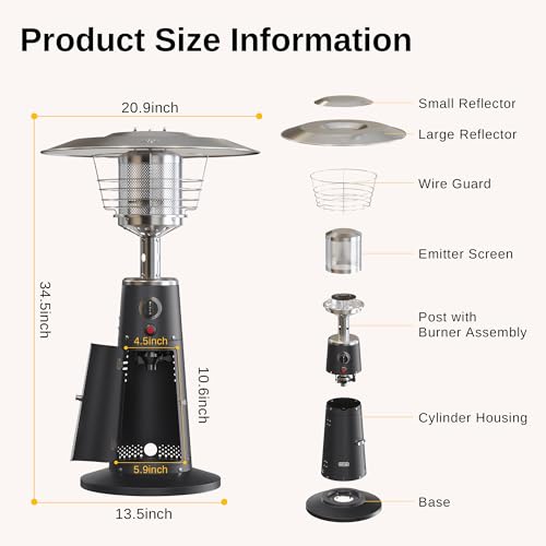 Portable & Durable Design: Compact and weighing only 15lb, our patio heater (20.9"D x 20.9"W x 34.5"H) is easily transportable. Portable heater is perfect for picnics and camping trips. Crafted with a 304 stainless steel burner for increased heat and rust resistance.