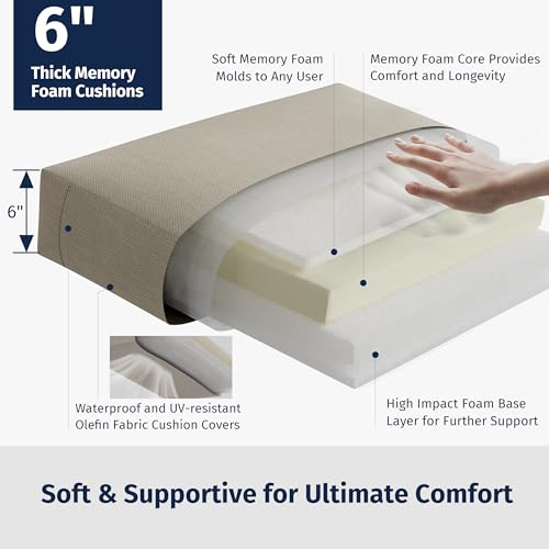 Ultimate Comfort: Featuring upgraded Olefin fabric and a 6-inch thick cushion, this outdoor patio furniture delivers a luxurious seating experience. The high-density foam provides robust support while ensuring breathability and comfort. The ergonomic design ensures optimal comfort.