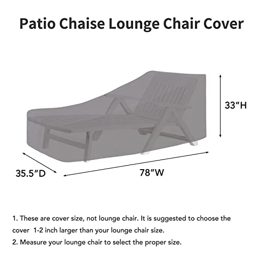 Size: This cover fits up to 78"Wx35.5"Dx33"H. Please measure your chaise lounge before purchasing. Multiple size options are available to to fit the different styles and brands of chairs, benches, loveseats or 3-seater sofas, chaise lounge of your outdoor garden, yard or patio.