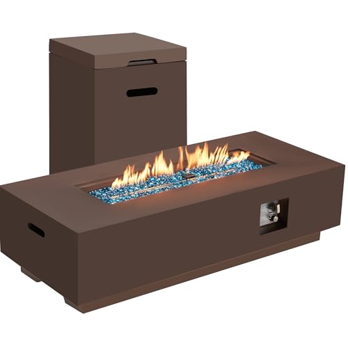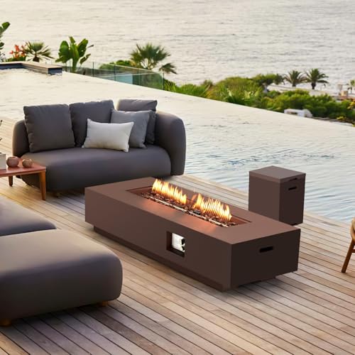 ?Dimensions & Packing Included?Table Size: 56"L x 23.8"Wx 15.5"H. Package includes: gray fire pit table with stainless steel lid, weather resistant cover, lava rocks and product manual. Classic and clean concrete-style square design adds style to any outdoor area, with built-in side handles to easily move it for a change of scenery.