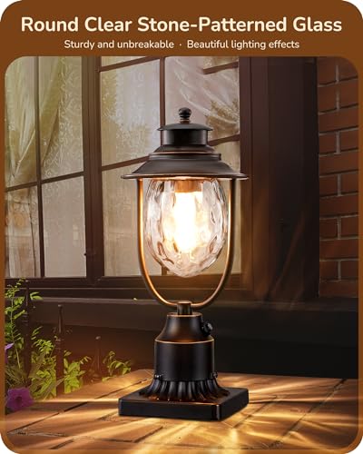 [Vintage Look & Stunning Illumination] Radiating timeless charm, our outdoor lamp post light with its vintage design, features a matte aluminum body, unbreakable tempered glass, and elegant gold rim; the light shines wonderfully through round and clear stone-patterned glass, creating an enchanting and gorgeous illumination