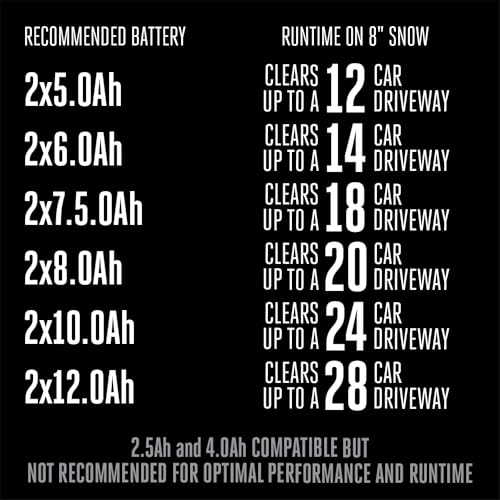 Clears up to a 14-car driveway with 8 inches of snow on a single charge when used with two recommended 6.0Ah ARC Lithium batteries (available separately)