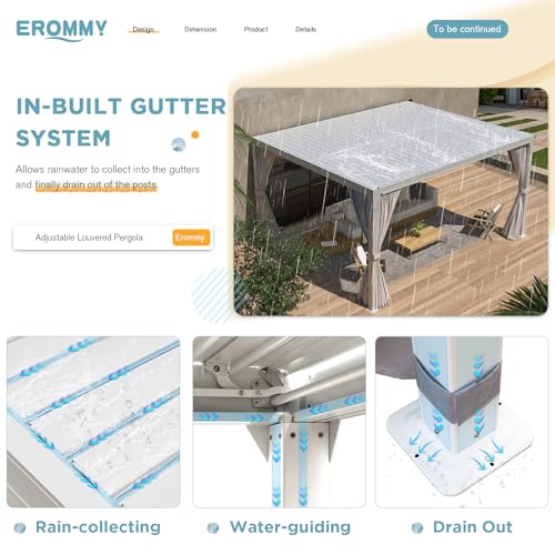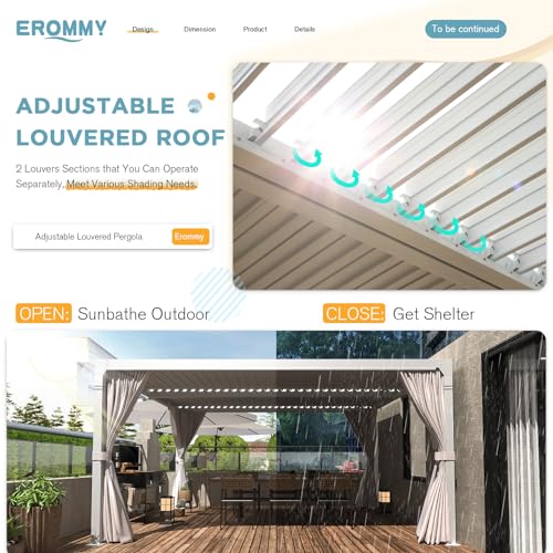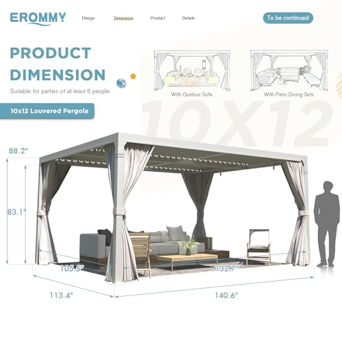 Easy Assembly: Components of the EROMMY 10x12 white louvered pergola are easily identifiable, and assembly instructions are straightforward. Following the steps in the manual, installation can be completed by 3-4 people in approximately 2-3 hours.