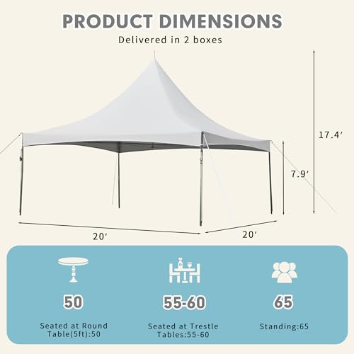 MULTIPURPOSE LARGE EVENT TENT: With an overall size of 20'L x 20'W x 17.4'H, this versatile gazebo is perfect for weddings, parties, trade shows, flea markets, fairs, and other outdoor events. Its spacious interior also makes it ideal for use as a carport, exhibition space, or temporary outdoor shelter