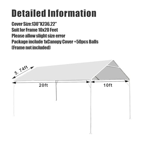 - Package includes 1x Canopy Cover & 50pcs balls. The carport cover (not include frame and poles) fits for most frame in size 10 x 20 feet on market. The length of the tarp is 236.22 inches and the width is 130 inches. It is perfect for residential and commercial use, please check your carport's size before purchase
