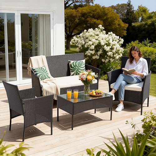 ??STRONG & STURDY?:This patio furniture set is made with a powder-coated steel frame and all-weather PE rattan wicker for a comfortable experience.The wicker of the Outdoor furniture set is sturdy but also very light. The seat cushion of this patio Conversation Set can be removed for easy cleaning.