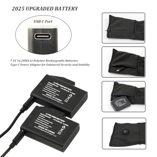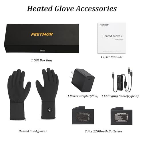 ?2025 Upgraded Battery?FEETMOR heated gloves liner feature a USB-C rechargeable 7.4V 16.28Wh battery and 20W PD adapter. Delivers faster heating, longer life, and more stable warmth than standard batteries—all in a compact, portable design.