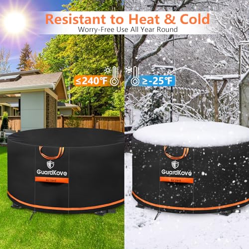??????Heat & Cold Resistant | Can Withstand Extreme Weather? The GuardKove firepit cover round is built with a highly weather resistant material that can withstand extreme temperatures from -25°F to 240°F. Whether it's a hot summer or a severe cold snowstorm, it can provide worry-free and lasting protection for the fire pit all year round, without frequent replacement, universal in all seasons, and stable protection!