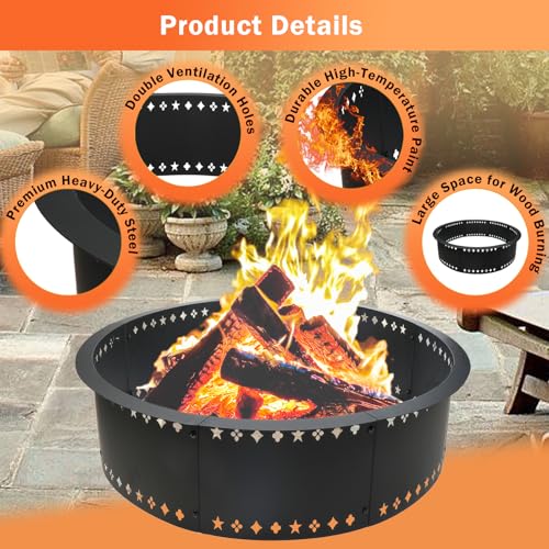 ?Premium&Durable?The 36“ fire ring for outside fire pit is crafted from sturdy heavy-duty steel and coated with a thick,high-temperature resistant paint.Engineered to withstand extreme temperatures(600°C/1110°F),Our outdoor firepit ring ensures long-lasting durability for years of outdoor enjoyment.