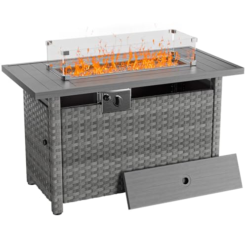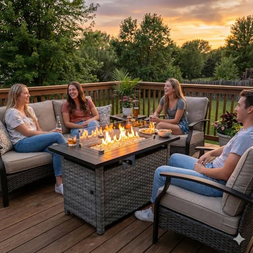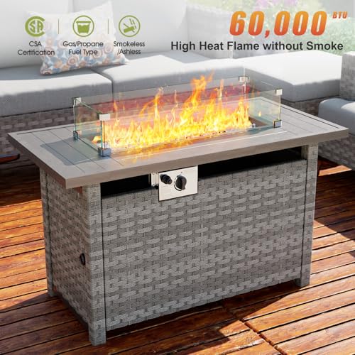 ?MULTI-FUNCTIONAL&MODERN FIRE PIT TABLE? Table with fire pit pan inside.You can use it as outdoor fire table or a dinning/ coffee table indoor. The fire table is made of wood look metal as tabletop and the table frame is wrapped with UV rattan. It’s very stylish. Will fit in perfectly with your wicker patio/deck furniture