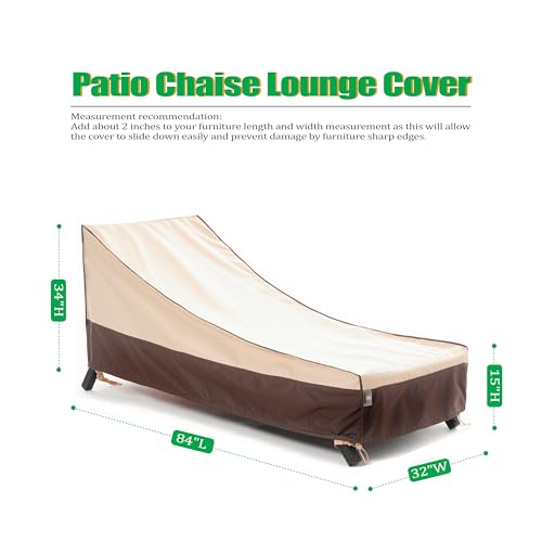 This outdoor lounge chair cover measures 86"Lx30"W x14"/30"H, Fits chaise lounges up to 83"Lx31"W.