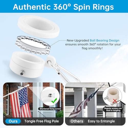 ?360°Tangle Free?:Upgraded Tangle Free Rings feature a new design with 360°rolling steel balls inside and two strong carabiners on the two flag pole rings, preventing the flag from tangling in the wind.The rotary flag poles can be adjusted to fit 2x3,3x5,4x6 different sizes of flagpoles