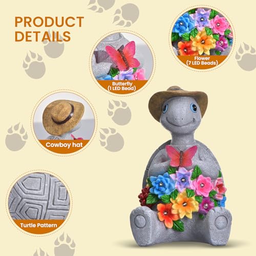 Adorable Garden Turtle Design: Seated turtle with a stylish cowboy hat, gently holding a colorful butterfly, sized 4.7x7.5x4.1 in. Adds vivid, whimsical charm to outdoor garden decor and backyard spaces.