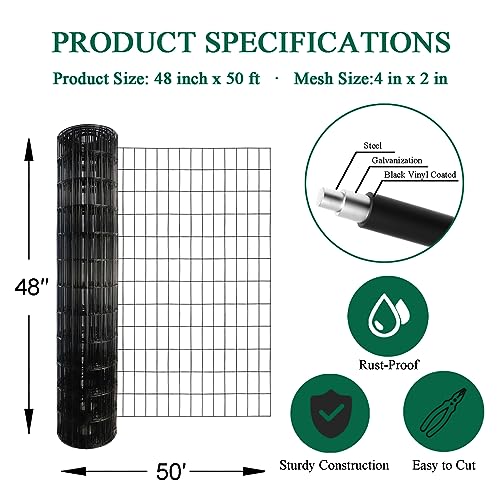 The wire diameter is 14G (inner wire diameter 1.85mm, after vinyl coating 2.25mm). Mesh size 2"x4". Measures 48 inches in height and 50 feet in length. Black color.