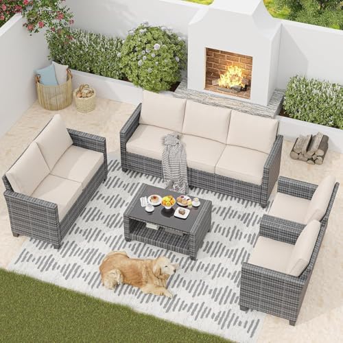 Outdoor Furniture Sectional Sofa with Storage Table: Featuring light grey PE rattan and khaki cushions, this set of patio furniture is the perfect addition to your patio, garden, backyard, pool and other indoor and outdoor Spaces. This modern outdoor sectional sofa has plenty of space with seven comfortable seats and a table for food and drinks.