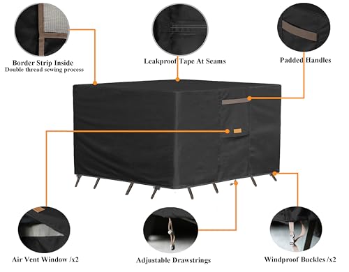 More Features: The rectangular furniture cover with four fastening straps with buckle,it can help the cover fit perfectly and prevent the cover from being blown off in windy days.And have air vents design,reduce inside condensation and wind lofting.And drawstring hem design ,allows adjustment for a custom tightness and offers a snug fit.