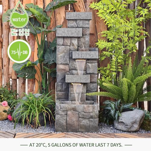 RELAXING WATER FLOWING; Water Cascading Down The Imitates The Sound of A Real Waterfall, Bring A Tranquil Ambience To Your Outdoor And Indoor Spaces, While The Soothing Sound of Water Helps Relieve Fatigue. Water Sound Up To 75 dB And Needs 3.5 Gallons To Make The Garden Fountains Outdoor Works.