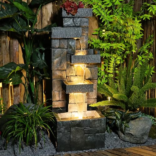 GARDEN DECOR & LIGHT; Modern Design And Light Weight And Easy To Storage And Move. There Are 4 LED Lights With A Combined Power of 10.8 W. The Outdoor Fountains And Waterfalls With Warm Glow LED Lights Is The Perfect For Your Outdoor Decor And Fits Put On Your Porch, Backyard, Garden or Lawn.