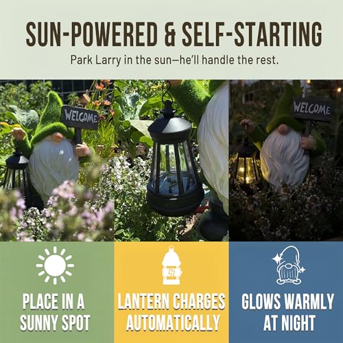 SOLAR POWERED GARDEN GNOME with LANTERN LIGHT - Powered by the sun for reliable nighttime illumination, this 11-inch garden gnome features an integrated solar panel that efficiently charges during the day and automatically lights its vintage lantern for 8 - 10 hours after dark. No batteries or wiring needed - just dependable, eco-friendly outdoor lighting that adds charm and warmth to your garden, patio, or yard.