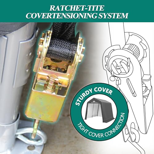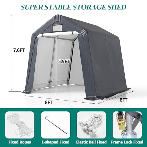 ????STURDY STEEL FRAME: The outdoor storage shelter shed is made of a rust resistant heavy-duty steel frame. SIZE: 8FT*8FT*7.6FT. The outdoor portable garage storage shed can hold Bike, ATV, Motorcycle Shelter, garden tools, lawnmower, patio furniture storage and so on