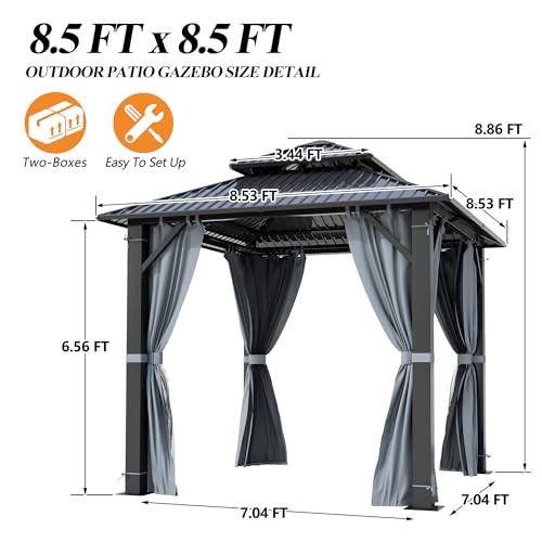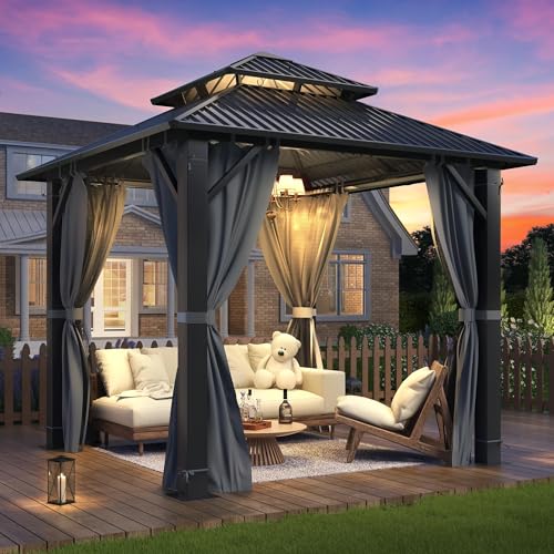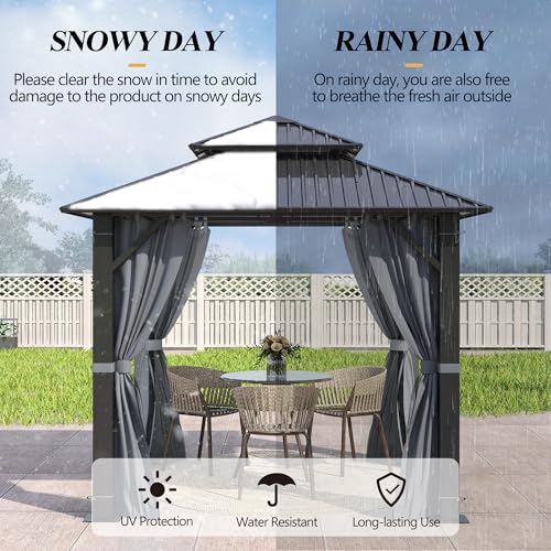 ????USEFUL ACCESSORIES: The gazebo equipped with top hooks in the middle of the roof of the gazebo that you can use to hang lights and decorations to boost your pleasant outdoor time. Hard Top Gazebo comes with removable mesh curtain and privacy curtain with zipper ensure UV protection and keeps good ventilation. Let you have full airflow at outdoor time