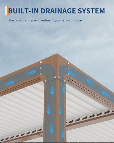 ?Built-In Drainage & No Leaks? - Featuring a smart concealed gutter system, rainwater flows from the louvers into the integrated columns and drains discreetly at the base. This advanced design prevents pooling and leaks, ensuring a dry space underneath your outdoor pergola, even during heavy downpours