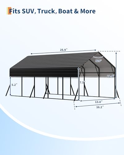 Generous Coverage for Your Large Investments: With a spacious 13' W x 25.9' L footprint and a peak height of 11.4', this shelter provides ample coverage for full-size trucks. The 7.5' side height easily accommodates compact RVs, boat trailers, and farm tractors, making it a versatile storage solution.