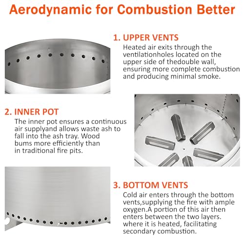 ????????Smokeless and Efficient Burn?This fire pit feeds more oxygen into the burning process and accelerates secondary flame generation to burn off smoke particles before it gets to your clothes and hair. Completely get rid of the inconvenience of a smoky flame, and enjoy your time outside.