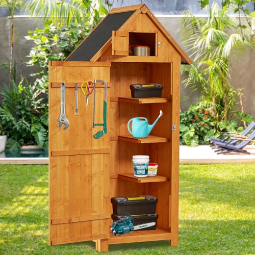 Efficient Storage Solution: This wooden outdoor storage cabinet features a unique design with 3 shelves for storing small items and a spacious area for storing long tools, offering flexible storage options. Additionally, it includes designated compartments on the top to safely store sharp tools, preventing children from accessing them and providing additional safety for your family.