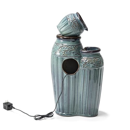 ?Classic Design: Featured with Classical and timeless clay pots design with delicate embossed texture. There is warm white LED lights for the 2 lower pots, the trickling water rippled and sparkled in the warm. Elegant and charming kiln-fired turquoise embossed glaze finish. With an antique look, the fountain brings a touch of natural beauty, the soft sound of cascading water is sure to make you relax and makes a soothing rest for you in the garden.